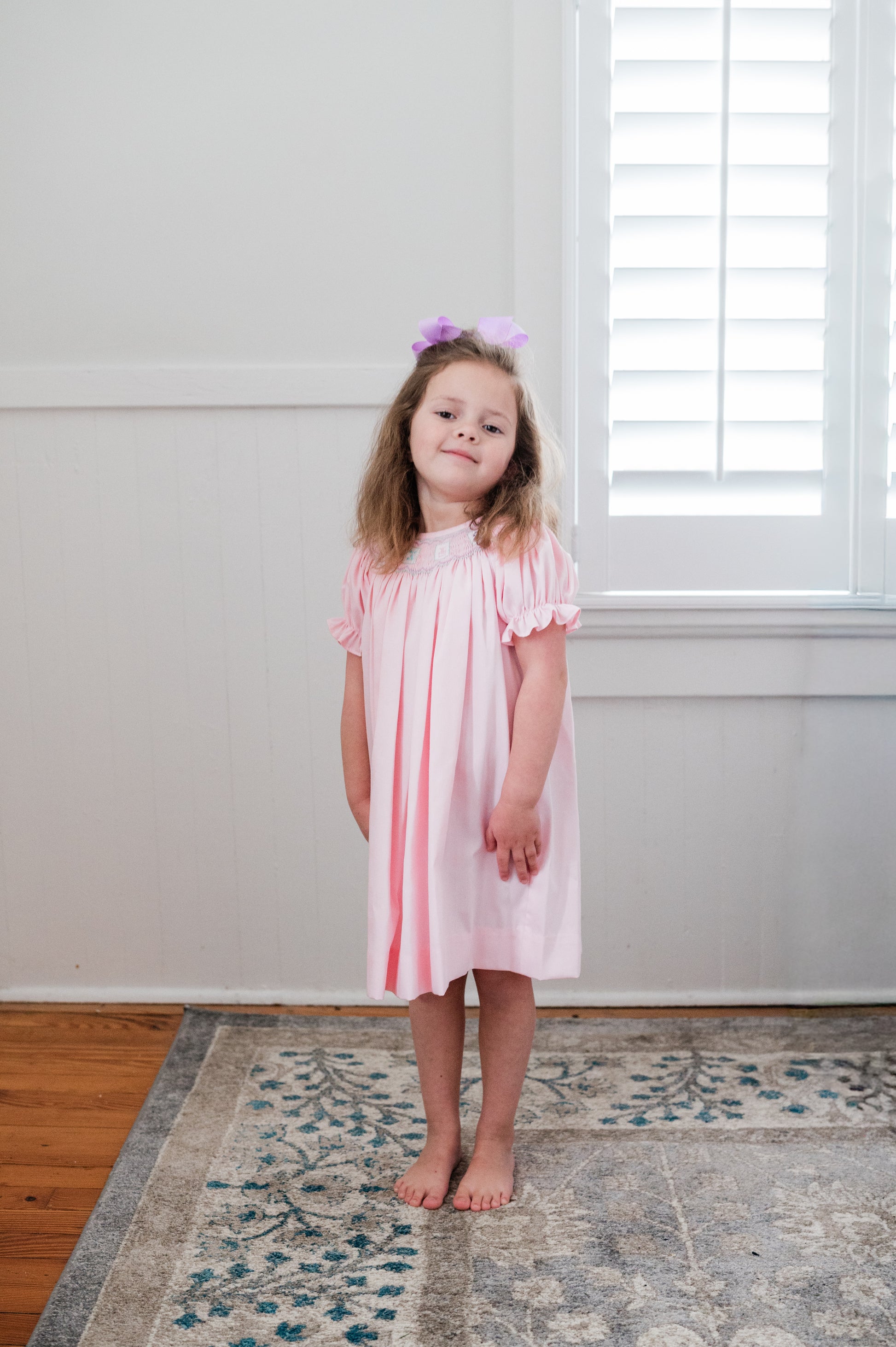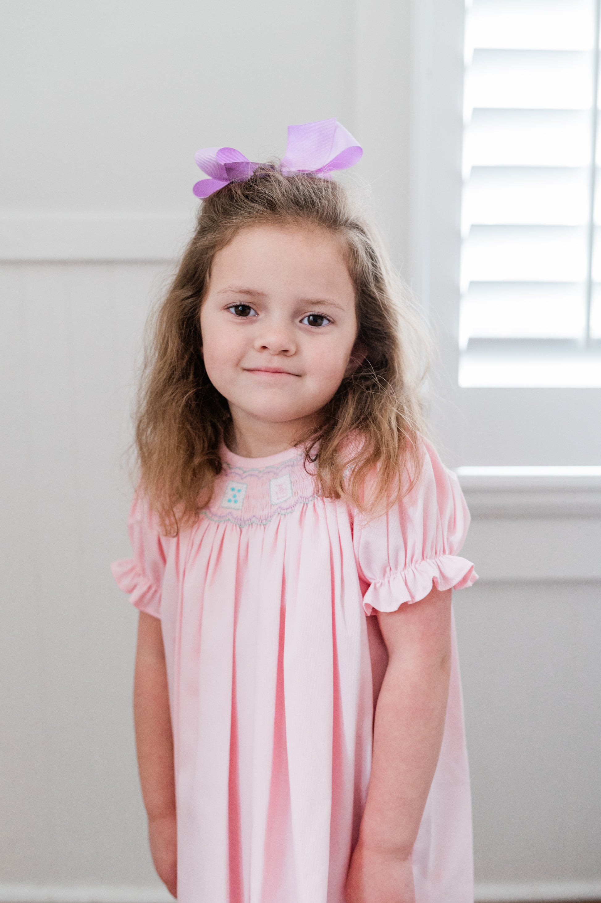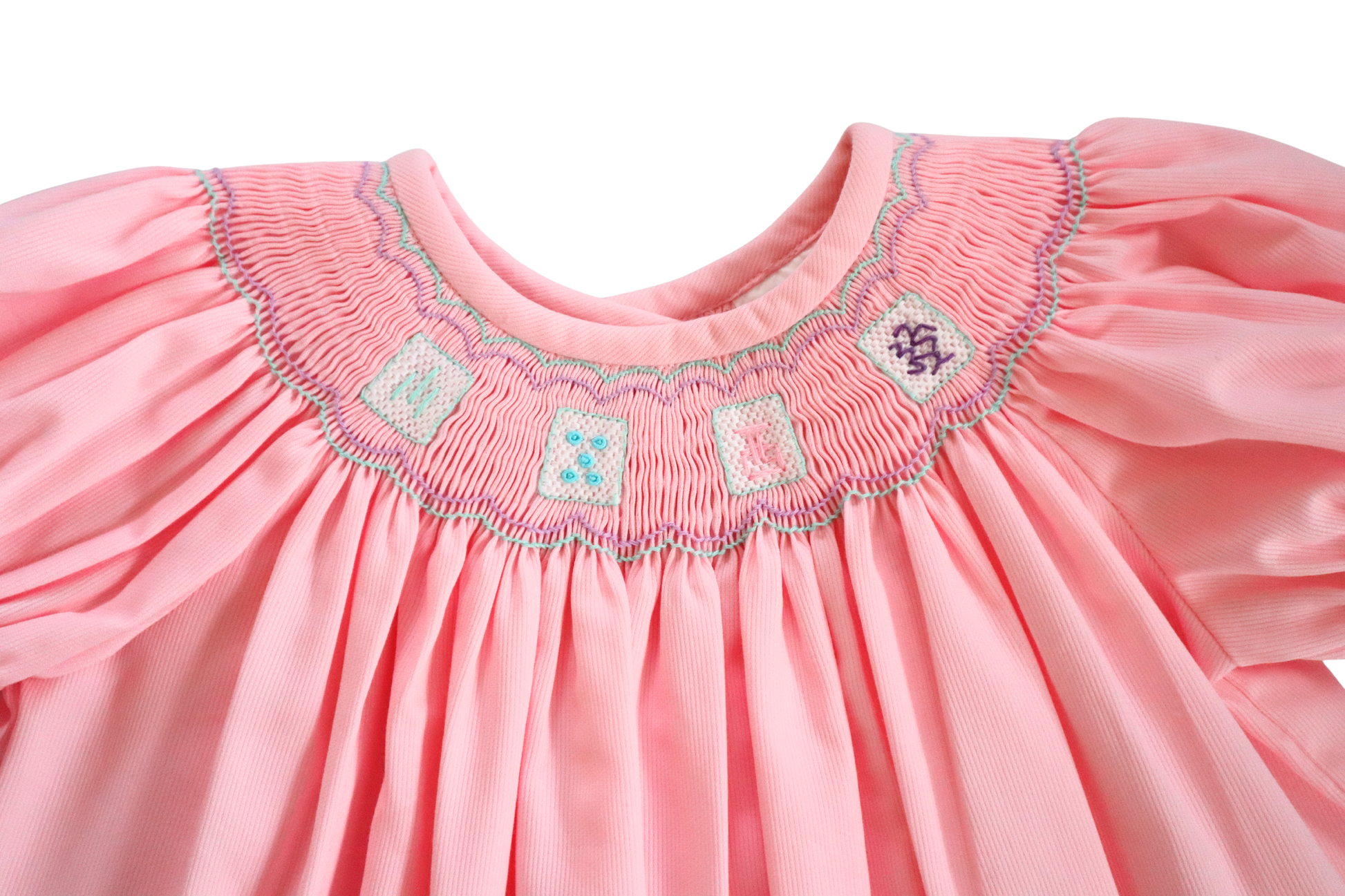 This sweet bishop features hand smocked pastel Mahjong tiles stitched across the yoke, framed with a delicate wave trellis above and below, the design is sewn on light pink piqué, it's perfect for a Mahjong playdate!